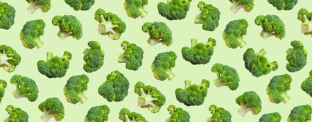 Regular Pattern Fresh Green Broccoli Yellow Background Minimal Concept Healthy Nutrition