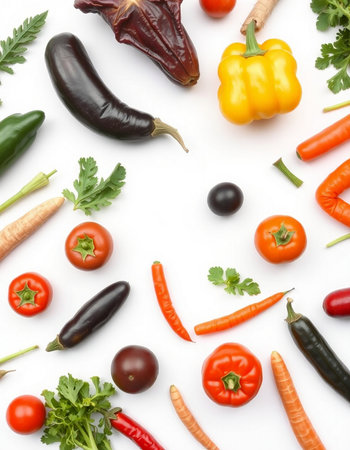 Fresh vegetables on white background. Top view. Flat lay pattern.