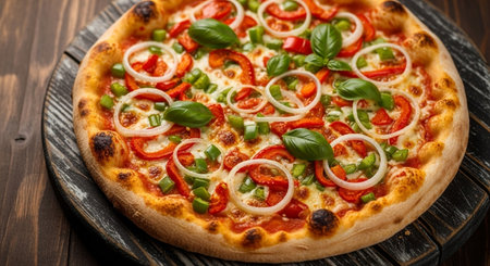 Healthy homemade vegetarian pizza on rustic wood table generated by artificial intelligence