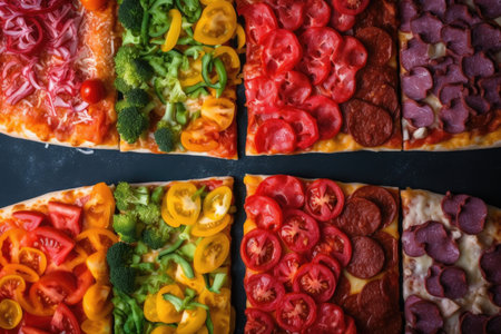 an assortment of pizza slices with different toppings, such as pepperoni and vegetable, created with generative ai
