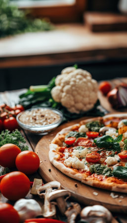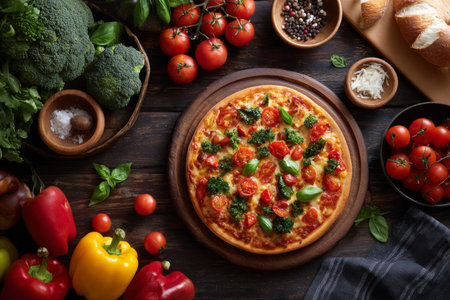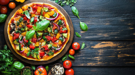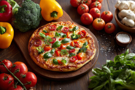 A vibrant vegetable pizza topped with fresh basil rests on a wooden table, surrounded by colorful ingredients like tomatoes and herbs, showcasing culinary artistry.