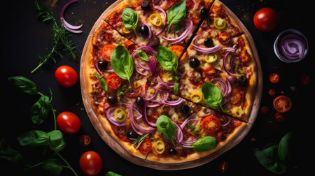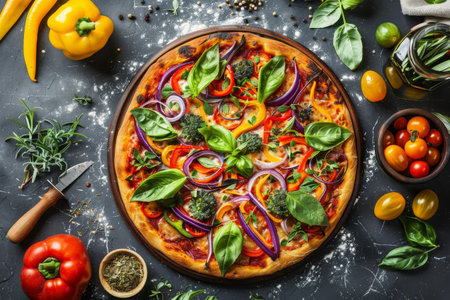 Homemade vegan pizza with tomatoes, peppers, olives, onions and herbs, top view.