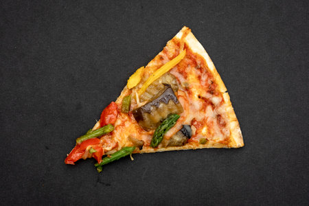 slice of tasty grilled vegetable pizza cooked with ingredients on black background. top view