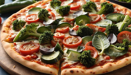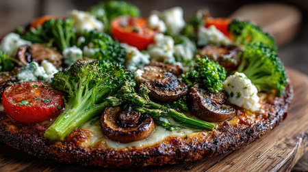 A mouthwatering vegetarian pizza featuring vibrant broccoli, juicy cherry tomatoes, and savory mushrooms, all melted together with creamy cheese on a rustic wooden board. Perfect for sharing at any meal.