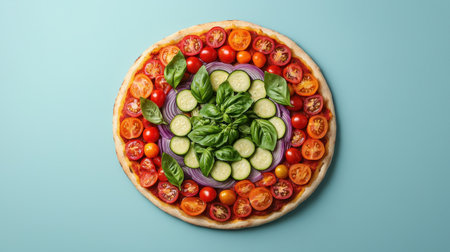 A colorful, vibrant pizza topped with fresh vegetables and basil, set against a light blue background.