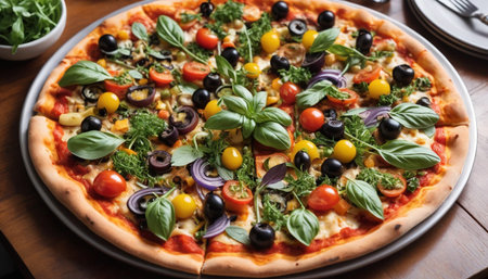 A vibrant vegetarian pizza featuring fresh herbs, olives, and colorful vegetables. Perfect for sharing at gatherings or enjoying as a tasty meal.