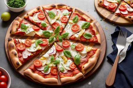 A vibrant image captures the joy of sharing a freshly baked pizza topped with juicy tomatoes and fresh basil. Surrounded by colorful vegetables like bell peppers and broccoli, the inviting scene takes place on a rustic wooden table, conveying a warm, communal atmosphere perfect for food lovers and gatherings.