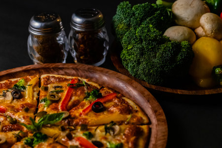 Portrait Photography of delicious Picante pizza with colourful vegetables kept on black surface.