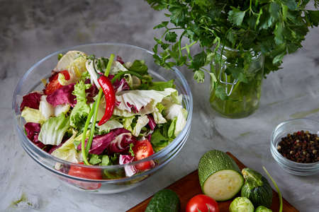 Cooking a healthy salad of vegetables and herbs, clean healthy food for detoxification. Vegan and vegetarian food.
