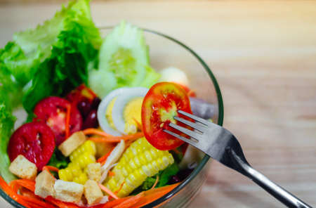 Close up of vegetable salad bowl and fork.Healthy eating, dieting, vegetarian kitchen and cooking.