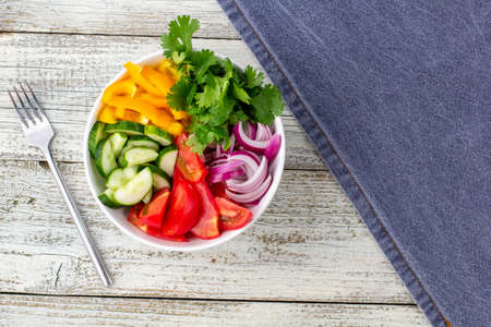 Plate of rainbow salad with different vegetables and herbs in white bowl with blue napkin and fork on white wooden background. Top view