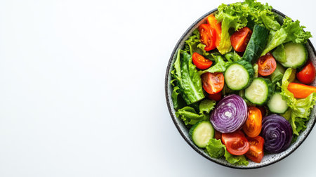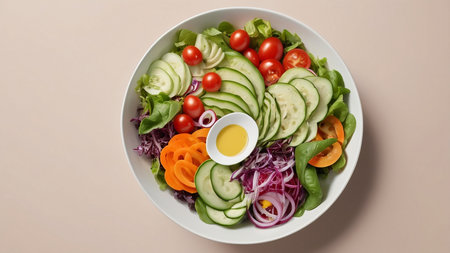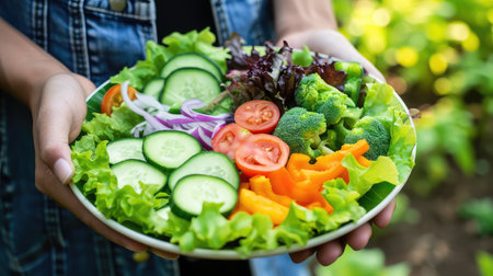 A large bowl brimming with a colorful mix of fresh vegetables, such as lettuce, tomatoes, cucumbers, and onions. AI Generation