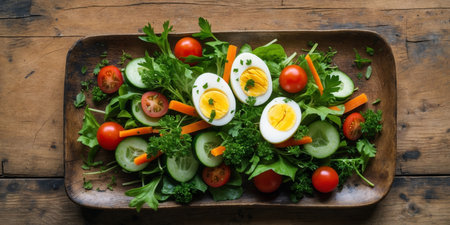 AI Generated. Wooden plate with fresh salad and boiled eggs on a wooden table background