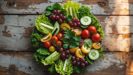 AI Generated. Colorful salad spread with fresh vegetables and fruits on a rustic wooden table setting