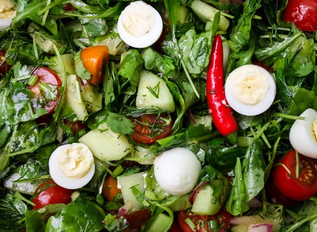 Easter Spring salad with quail eggs, tomatoes and cucumbers. Close-up.