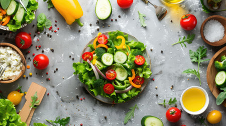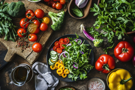 Vegetables and greens laid out for salad, vegetarian food preparation. low-calorie diet menu, vitamins from products Generative AI