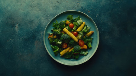 A vibrant mixed salad featuring fresh vegetables like tomatoes, corn, and broccoli, artfully arranged on a blue plate, perfect for healthy meals.
