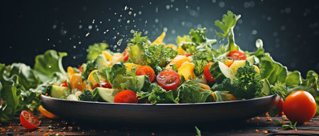 A dynamic shot of fresh salad ingredients in a glass bowl, capturing the essence of healthy eating and culinary creativity, ideal for nutrition and cooking enthusiasts.