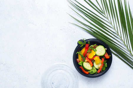 Salad with fresh summer vegetables top view on white background with copy space. Natural organic healthy vegetarian food.