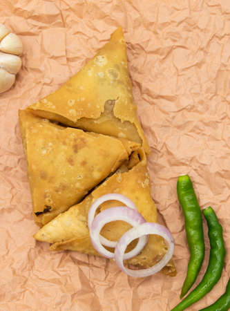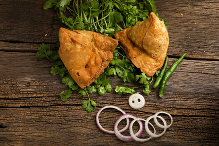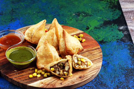 Traditional Indian cuisine samosas baked pastry with savoury filling, popular Indian snacks with spices on rustic background, top view.