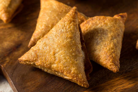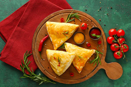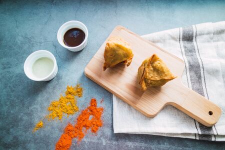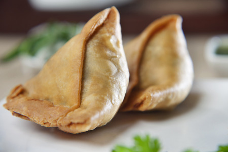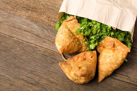 Samosas filled with lamb and chicken on a wooden table. Indian cuisine Close up view.
