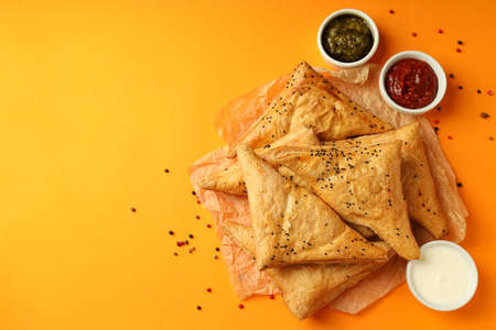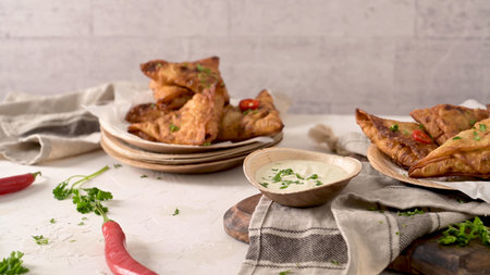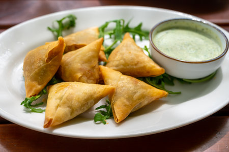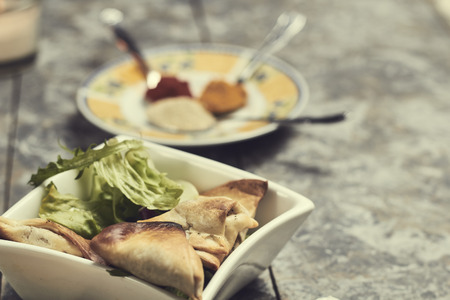 Traditional Middle East snack fried stuffed samosa pies with vegetables served with mint sauce