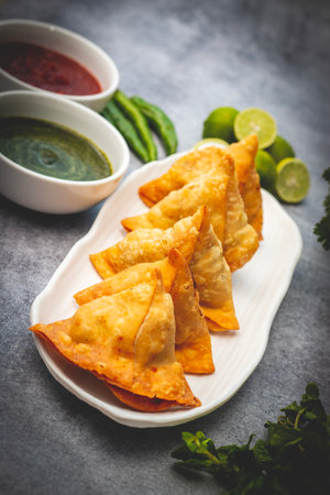 Vegetarian samosas with sauces, close up. Fried potato samosa in plate. Indian cuisine