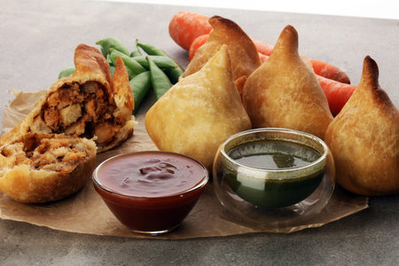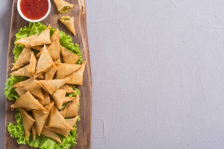 Samosa, samsa or somsa are triangular fried pastries or pastri served with tomato sauce and leek slice, on table