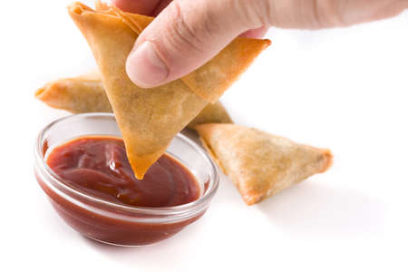 Hand with samosa dipping in sweet and sour sauce isolated on white background. Traditional Indian food