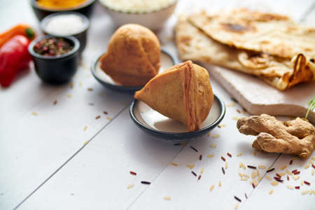 Traditional Indian Food snack Samosa served in a plate on a white wooden table. India food background and texture with copy space