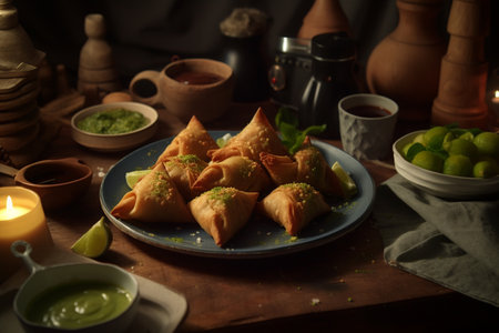 Ramadan iftar meal . Traditional asian vegetarian food samosa