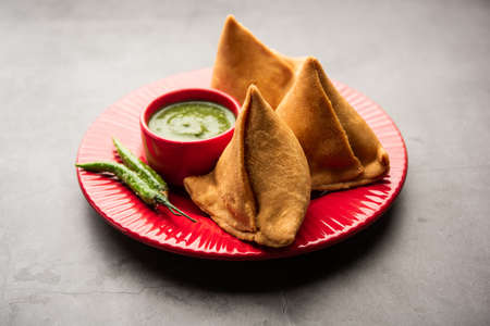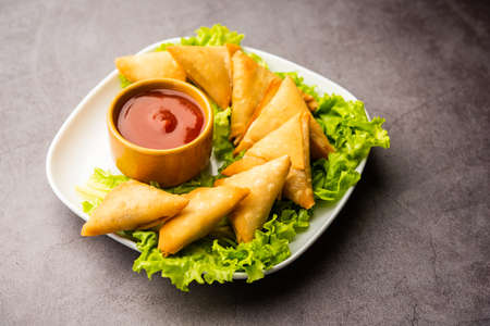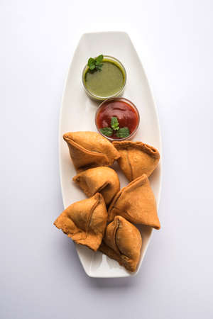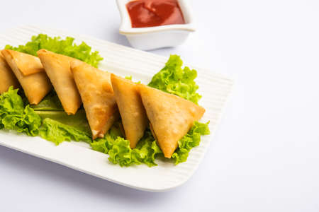 Samosa - Triangle shape fried / baked pastry with savoury filling, popular Indian Tea Time snacks, served with green chutney, tomato ketchup