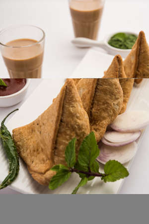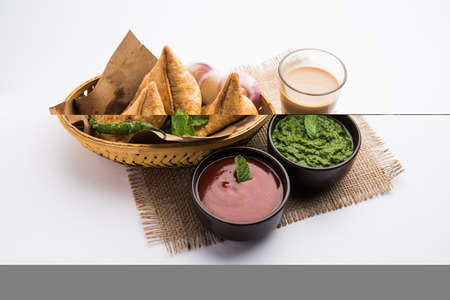Indian snack Homemade spicy and delicious samosa served with green, tamarind chutney cutting masala tea, chai,
