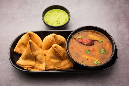 South indian Sambar Samosa Chutney it's a fusion food in which sambhar is from South and Samosas are from North India. served with green chutney.