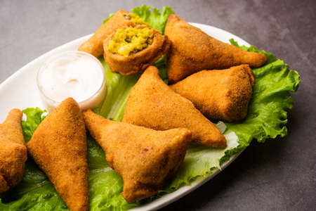 Vegetarian samsa or samosas.Indian special traditional street food punjabi samosa or Coxinha, Croquete and other Fried Brazilian Snacks. traditional fried food