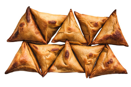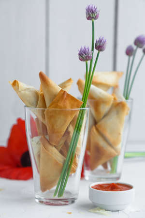 baked in the oven indian samosa made with phyllo with spicy potatoes and vegetables with black sesame seeds. street traditional fast food