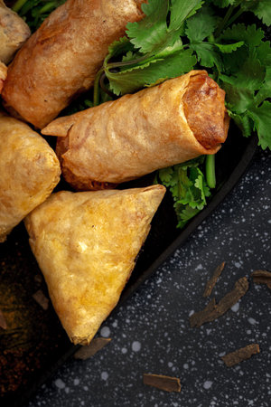 Asian food. Vegetarian samsa with tomato sauce and herbs. Dark background
