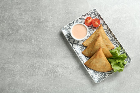 Fresh delicious crispy samosas served on gray table, top view. Space for text
