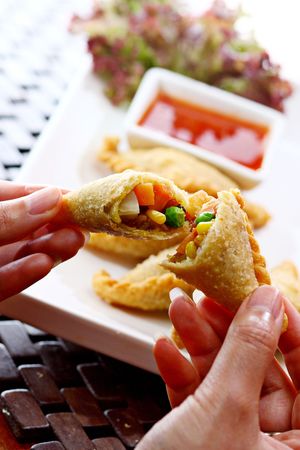 Poppy seeds Vegetable samosa served with sweet chilli sauce