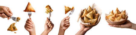Set of hand holding crispy fried samosa, baked pastry, vegetable meat spice filling, with fork, takeaway plate bowl, pile stack bite broken, isolated cutout. Many