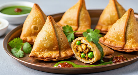 Indian snacks vegetable Samosas a spicy blend of vegetables wrapped in a deep fried triangular pastry parcel, fried Indian food. AI Generative.