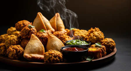 Variety of Indian snacks including samosa, pakora/pakoda or pattice with tomato chutney