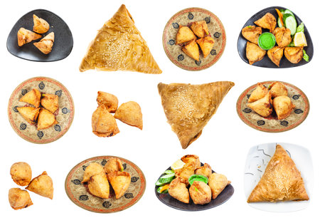 set of various Samsa and Samosa dishes (savory pastry) isolated on white background