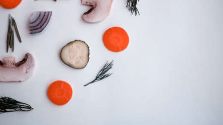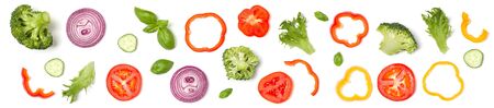 Creative layout pattern made of tomato slice, onion, cucumber, asparagus, microgreen, pepperу Flat lay. Food concept. Vegetables isolated on white background. Copy space