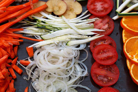Close up assorted cut and sliced fresh vegetables on black cooking board, high angle view