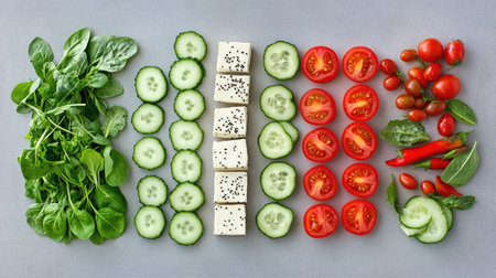 Fresh, Colorful Salad Ingredients Arranged in Rows A Vibrant Vegetarian Meal Prep Concept