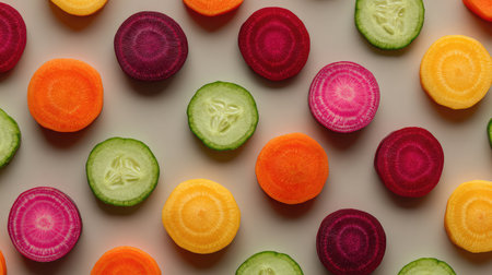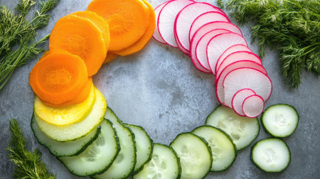 A vibrant circular display of freshly sliced vegetables including radish, carrots, and cucumbers on a textured background, perfect for culinary inspiration and healthy recipes.