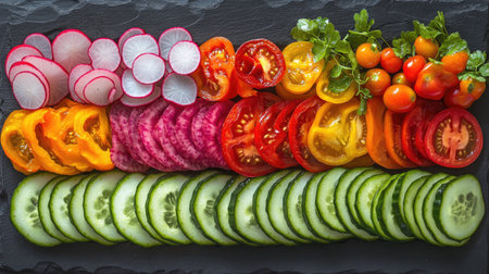 A vibrant display of assorted fresh vegetables, including tomatoes, cucumbers, bell peppers, and radishes, beautifully arranged on a slate background. Perfect for healthy recipes!
