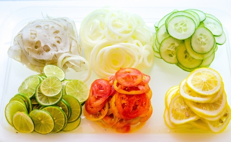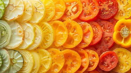 An eye-catching display of fresh fruit and vegetable slices arranged neatly on a clean surface, showcasing vibrant colors and healthy choices for cooking and snacking.