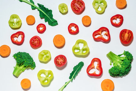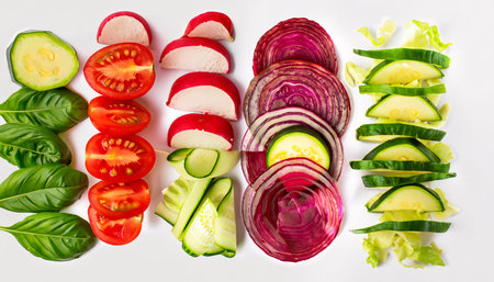 Overhead view of a vibrant arrangement of fresh, sliced vegetables